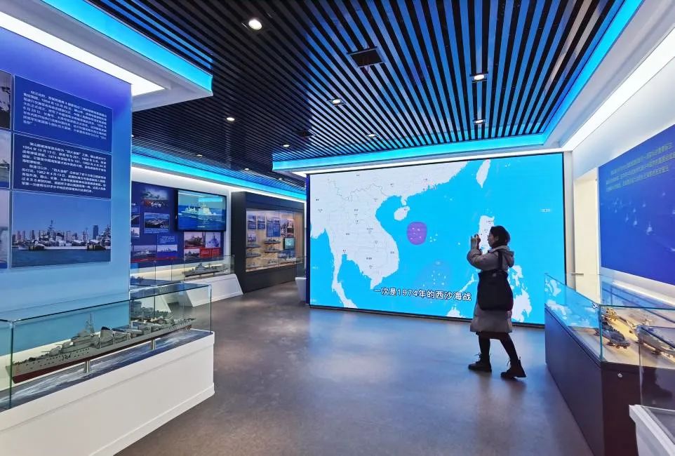現(xiàn)代海軍裝備主題展館分室內(nèi)、室外兩個(gè)展區(qū),設(shè)立六個(gè)篇章,重點(diǎn)展示了人民海軍成立以來艦船裝備從沿岸近海到走向深遠(yuǎn)海的代表成果。除圖文影視、模型外,展覽還引入了航母艦載機(jī)起降虛擬體驗(yàn)、海盜射擊游戲、艦載機(jī)起飛指揮等多個(gè)體驗(yàn)互動(dòng)類項(xiàng)目。