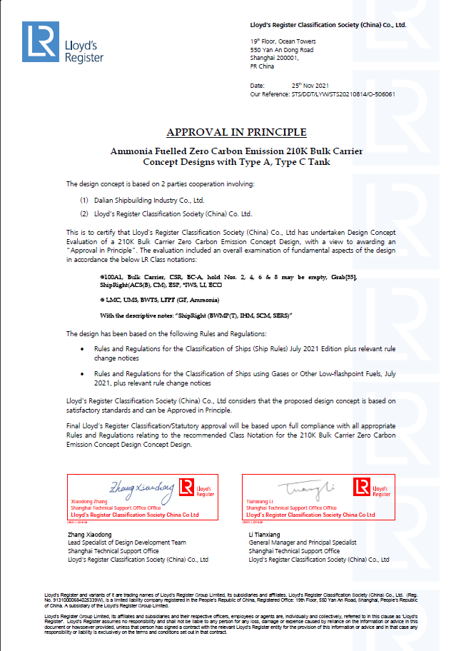 2月25日,中國(guó)船舶集團(tuán)旗下大船集團(tuán)最新研發(fā)的液氨動(dòng)力21萬噸散貨船設(shè)計(jì)方案,獲英國(guó)勞氏船級(jí)社(LR)原則性認(rèn)可(AIP)證書。