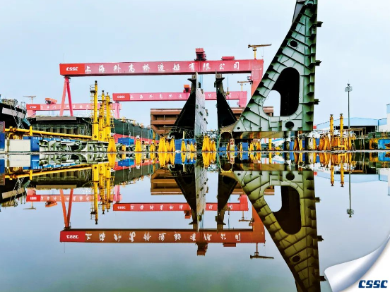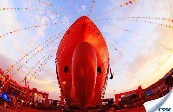 黃埔文沖建造的1400TEU雙燃料集裝箱船即將下水,美麗的船船與嫻麗多彩的天空融為一體,展現(xiàn)出一幅展翅欲飛場(chǎng)景。