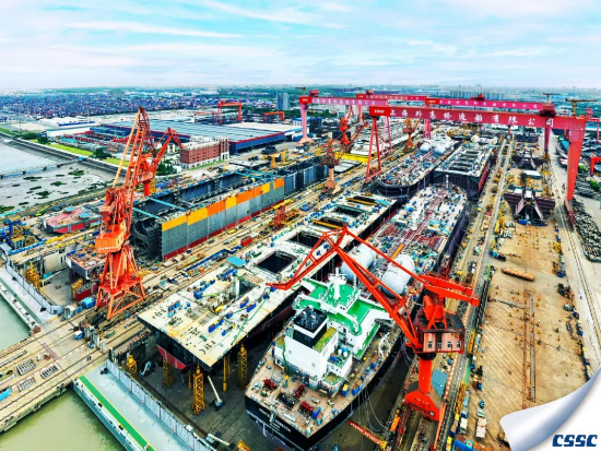 在高壓防疫狀態(tài)下,全面推進(jìn)復(fù)工復(fù)產(chǎn),船塢碼頭開足馬力建造,船塢中民船、海工、郵輪并排建造。