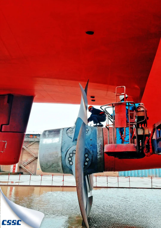 中午,船廠的工人們正在為設(shè)備最后調(diào)試,龐大的紅色船身和渺小的作業(yè)人員,形成了鮮明有趣的對(duì)比,正是有千千萬(wàn)萬(wàn)小小的我,成就了大大的深藍(lán)夢(mèng)。