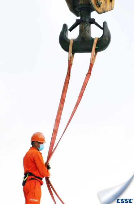 一名船舶起重工正在準(zhǔn)備起吊直徑10米、重約5噸的玻璃鋼材質(zhì)頂部圓盤至船舶上安裝,正值“梅花”過境后的陰雨天氣,身穿橙色工作服的船舶起重工在橙色吊帶、玻璃鋼材質(zhì)圓盤以及灰色天空下,構(gòu)筑了一幅簡約而又濃墨重彩的線條與內(nèi)容相輔相成,彰顯了船舶工業(yè)之美、勞動(dòng)光榮之美。