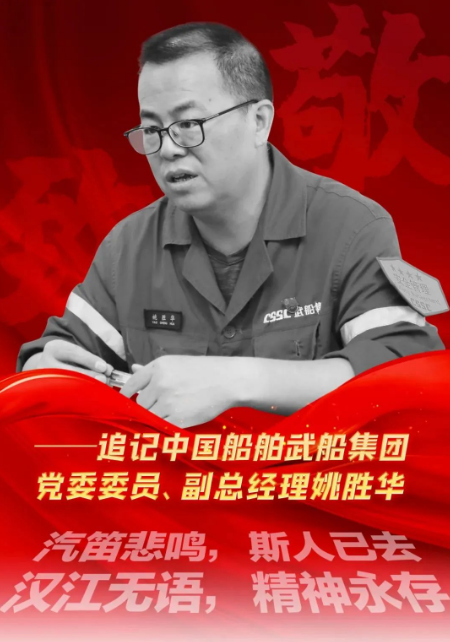 汽笛悲鳴,斯人已去;漢江無(wú)語(yǔ),精神永存。中國(guó)船舶集團(tuán)有限公司旗下武昌船舶重工集團(tuán)有限公司黨委委員、副總經(jīng)理姚勝華,一位沉默、訥言的人,他把自己熬干了、燃盡了,默默地用理想和信念、用忠誠(chéng)和熱血、用苦干與實(shí)干鑄就的,是一座偉大的豐碑!他的精神就像一面高高飄揚(yáng)的旗幟,跨越時(shí)空,熠熠生輝!