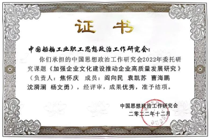 近日,由中國船舶工業(yè)職工思想政治工作研究會(huì)申報(bào)的中國思想政治工作研究會(huì)2022年委托課題《加強(qiáng)企業(yè)文化建設(shè),推動(dòng)企業(yè)高質(zhì)量發(fā)展研究》評(píng)審結(jié)果公布,成果優(yōu)秀,報(bào)經(jīng)中央宣傳部領(lǐng)導(dǎo)審定準(zhǔn)予結(jié)項(xiàng)。這是中國船舶政研會(huì)首次承擔(dān)中國政研會(huì)委托課題并獲評(píng)優(yōu)秀。