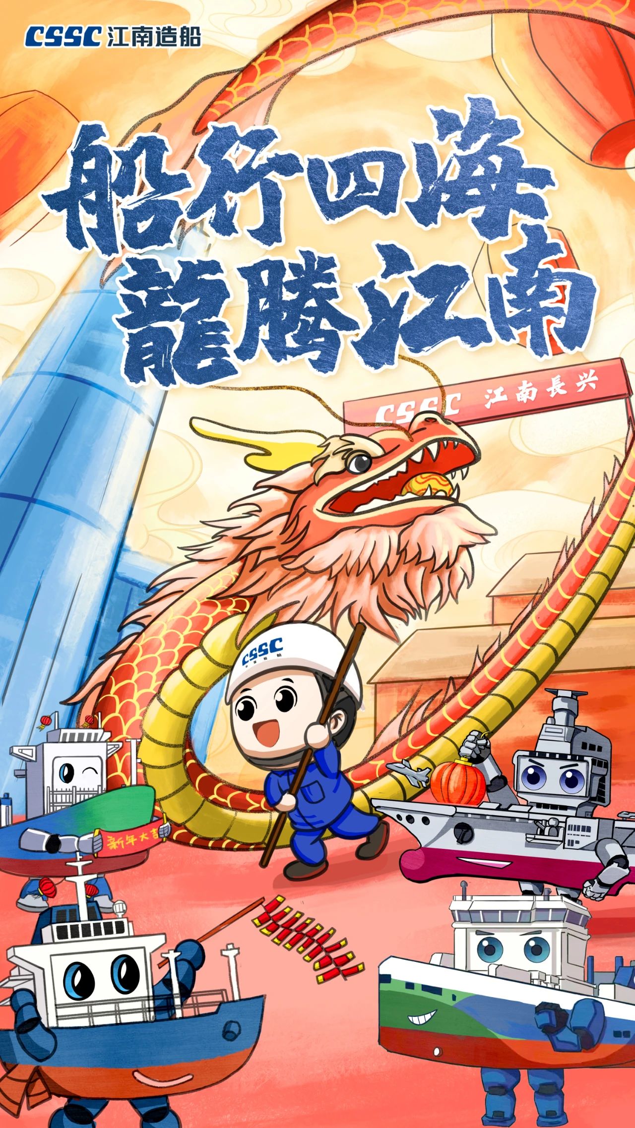 創(chuàng)意說(shuō)明:海報(bào)中“江小南”舞起龍頭,預(yù)示著在新的一年,江南造船將賡續(xù)努力,龍頭揚(yáng)起、再創(chuàng)新績(jī)!而跟隨舞動(dòng)的則是目前江南造船在建的集裝箱船、液化氣船和汽車(chē)滾裝船等主產(chǎn)品系列。