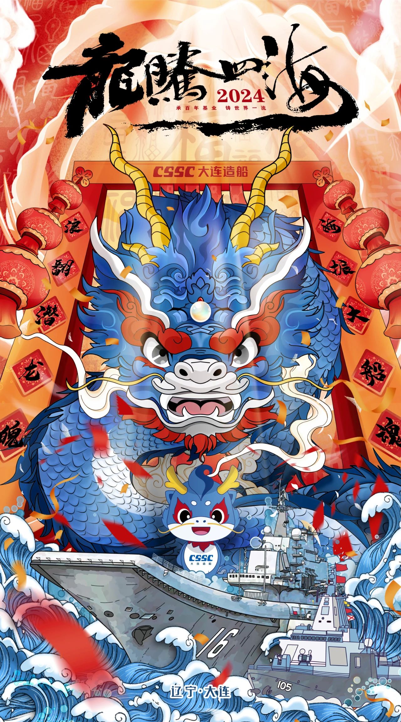創(chuàng)意說(shuō)明:采用國(guó)潮手繪風(fēng)格,將中國(guó)傳統(tǒng)文化元素和大連造船遼寧艦、大連艦等企業(yè)特色相結(jié)合,以彰顯造船龍頭企業(yè)的榮耀和奮發(fā)向上的精神。整體設(shè)計(jì)采用上中下三個(gè)部分的排列方式,比例為1:2:1。