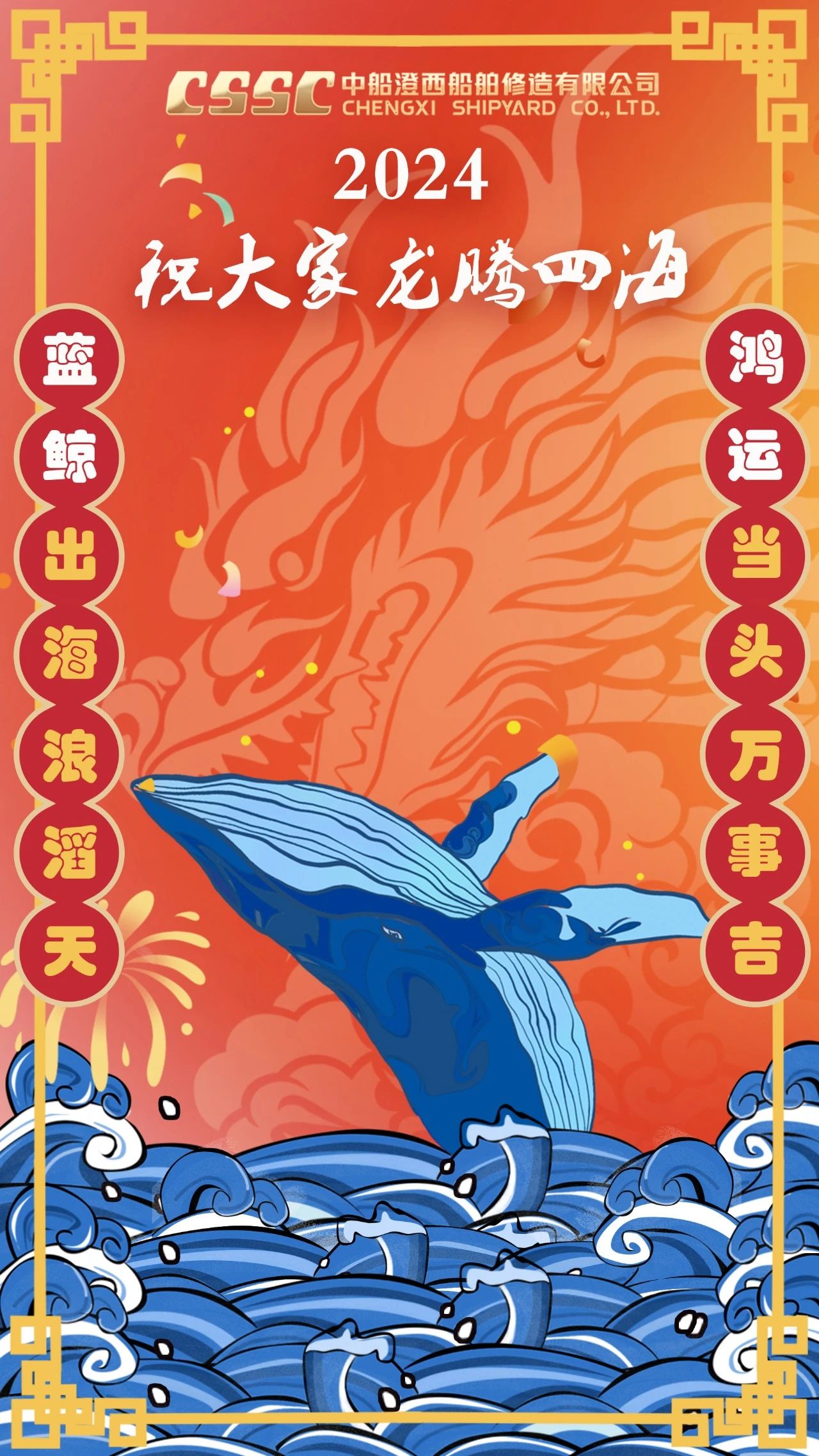 創(chuàng)意說(shuō)明:海報(bào)以龍年為主題,主體為藍(lán)鯨。自研8萬(wàn)噸級(jí)散貨船“藍(lán)鯨”系列和5萬(wàn)噸級(jí)油化船“鴻運(yùn)”系列是中船澄西命名的品牌船型,凝結(jié)了公司全員智慧。