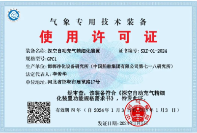 日前,中國(guó)船舶集團(tuán)七一八所研制生產(chǎn)的GPC1型探空自動(dòng)充氣精細(xì)化裝置,成功獲得中國(guó)氣象局頒發(fā)的氣象專用技術(shù)裝備使用許可證,成為繼GQD1型自動(dòng)水電解制氫設(shè)備后,第二個(gè)獲此證書的裝置,在氣象領(lǐng)域開(kāi)拓中邁出重要一步。
