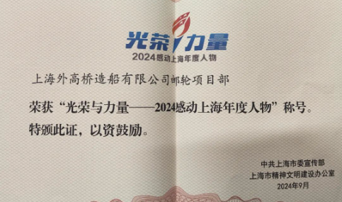 “光榮與力量——2024感動(dòng)上海年度人物推選活動(dòng)”獲獎(jiǎng)名單日前揭曉。中國(guó)船舶集團(tuán)外高橋造船郵輪項(xiàng)目部獲評(píng)“2024感動(dòng)上海年度人物”。本次活動(dòng)以2023年8月至2024年7月中,上海市涌現(xiàn)的事跡突出、精神可嘉、社會(huì)認(rèn)可的模范人物和先進(jìn)集體為推選對(duì)象,通過(guò)175萬(wàn)市民網(wǎng)絡(luò)投票和專家評(píng)審?fù)七x出先進(jìn)典型。