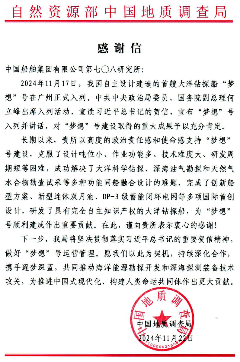 中國地質(zhì)調(diào)查局在信中對中國船舶集團七〇八所在“夢想”號立項論證、研發(fā)設(shè)計、建造調(diào)試等階段所做的突出工作和卓越貢獻表示感謝。