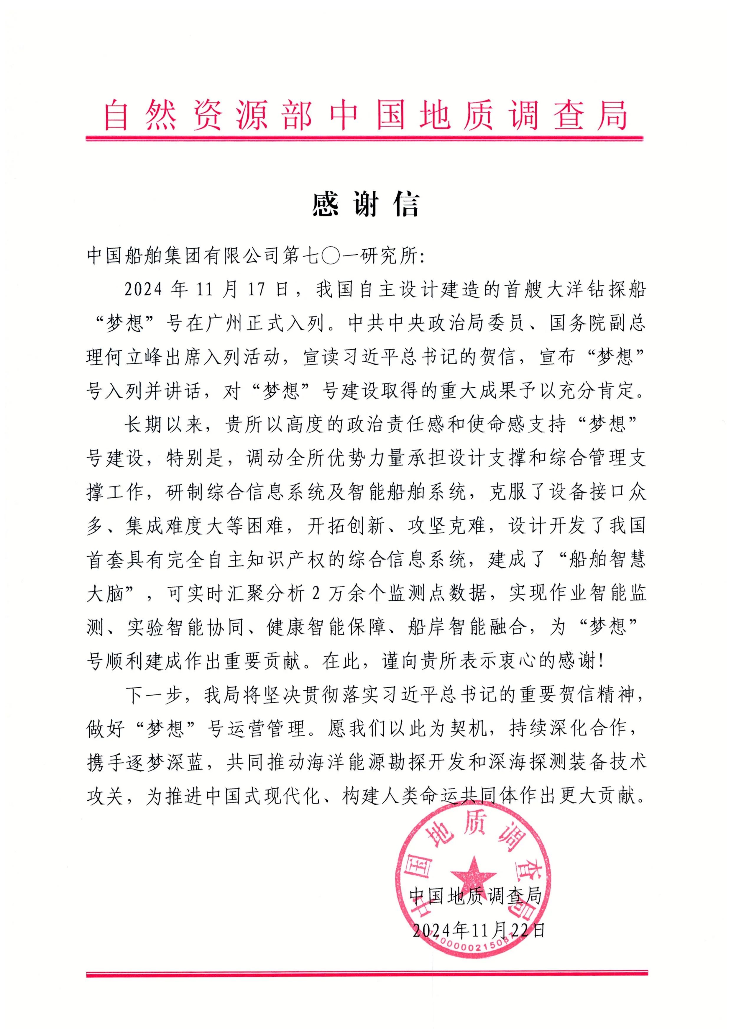 中國地質(zhì)調(diào)查局在信中對中國船舶集團七〇一所在“夢想”號設(shè)計支撐和綜合管理支撐、綜合信息系統(tǒng)及智能船舶系統(tǒng)研制等方面所做的重要貢獻表示感謝。