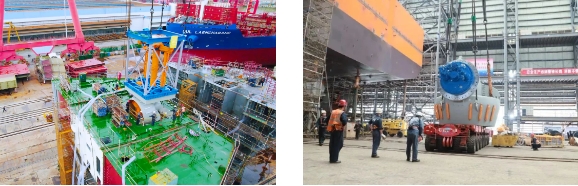 “夢想”號配備的7臺推進(jìn)器中,3臺全回轉(zhuǎn)伸縮推是黃埔文沖迄今總成過的最大伸縮推,并且建造過程中伸縮推需要進(jìn)行全程升降試驗(yàn),升降高度差達(dá)4.3米。完成試驗(yàn)的伸縮推總段重量超過了船廠龍門吊最高900噸的起重能力?!皦粝搿碧柟に囏?fù)責(zé)人馮仕清創(chuàng)新性地提出了采用龍門吊和履帶吊聯(lián)合吊裝的方法,最終保證了伸縮推的成功安裝。
