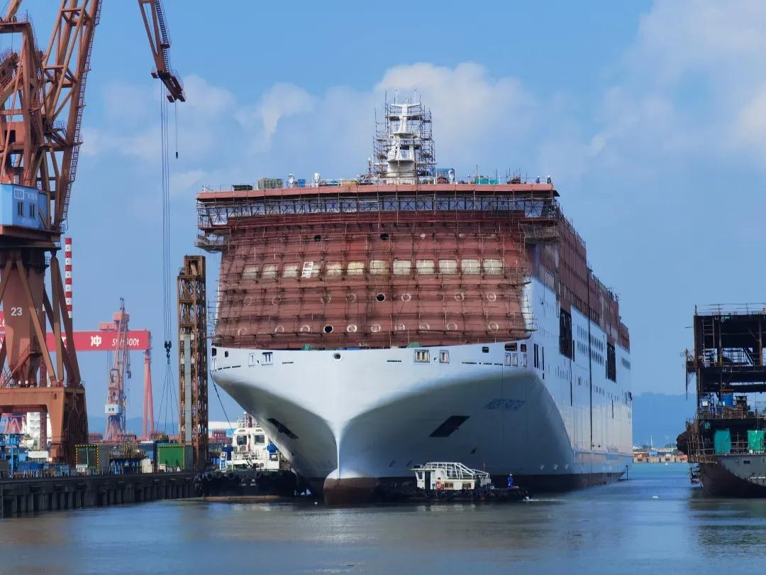 該船實現(xiàn)了出塢前上建亮燈。電纜拉放完成率87.8%,作為全球最大的豪華客滾船,該船全船電纜長度達到了946公里(相當(dāng)于從廣州到重慶);出塢前已完成了830公里電纜的拉放工作。涂裝完整性實現(xiàn)突破,該船出塢時上層建筑上方仍有部分區(qū)域未完成涂裝? 這是因為該船垂直高度已接近40米,超過了船塢高空車的最大極限。