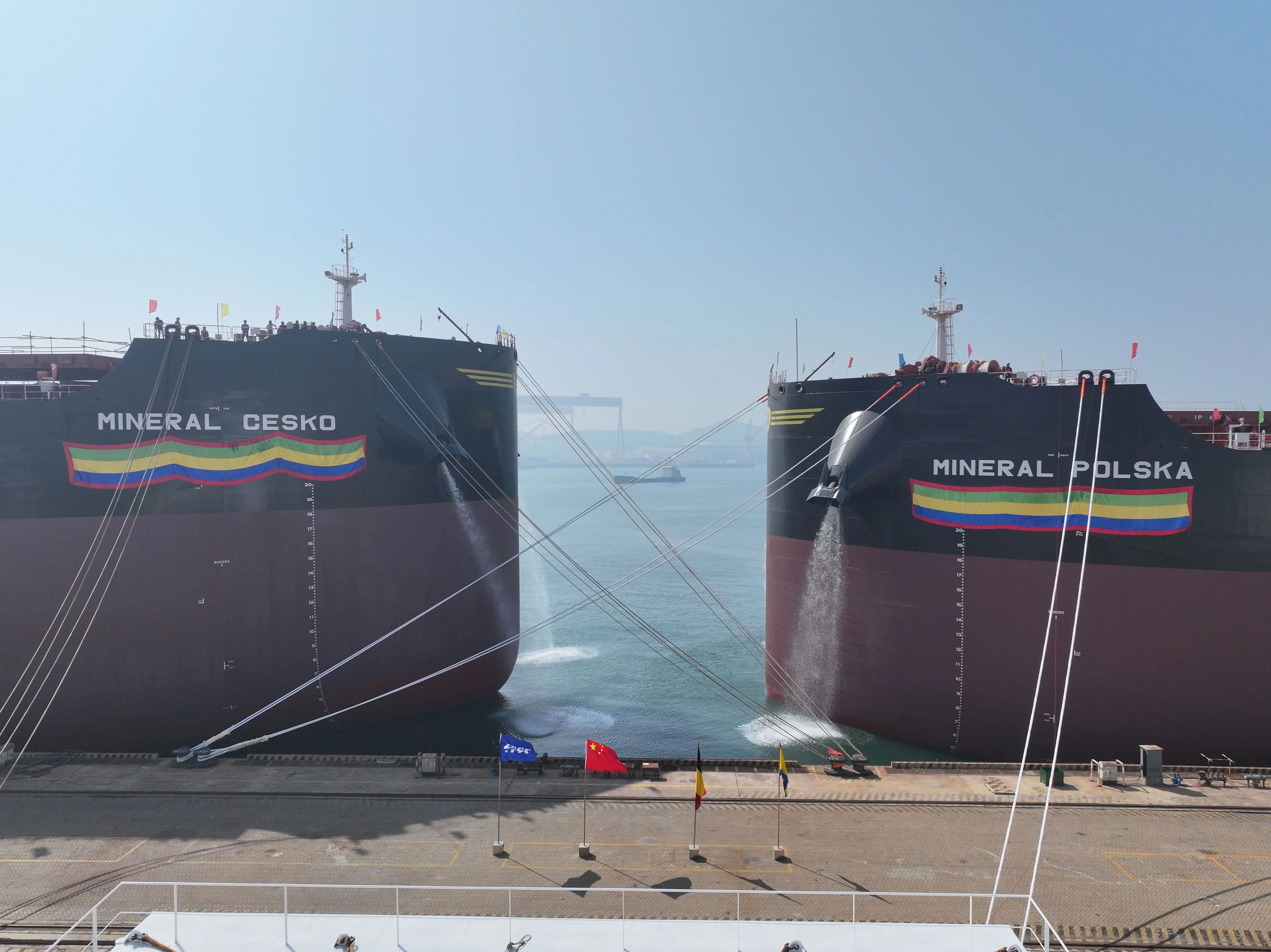 5月20日,北海造船為比利時(shí)CMB.TECH公司建造的2艘21萬噸氨燃料預(yù)留散貨船“MINERAL?CESKO”號(hào)和“MINERAL?POLSKA”號(hào)同日命名。