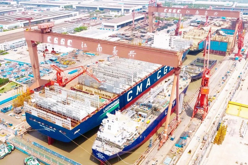 ????眾所周知,船塢是船舶總組搭載的場(chǎng)所,是造船生產(chǎn)的核心資源。江南造船3號(hào)船塢長(zhǎng)580米、寬120米,是目前國(guó)內(nèi)在用的最大船塢。為提升船塢利用效率,江南造船采取“雙線并造”模式,即一批次液化氣船和一批次超大型集裝箱船同時(shí)建造。此次雙船出塢是江南造船“雙線并造”模式的第五個(gè)批次,也是今年3號(hào)塢出塢的第二個(gè)批次。