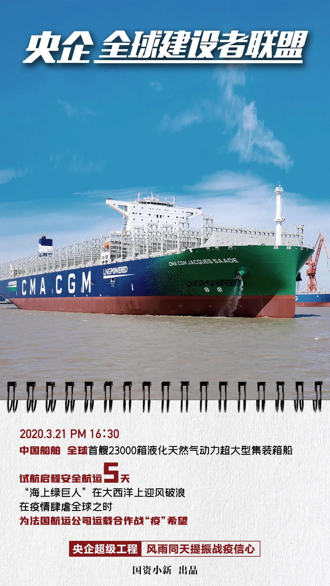 ????今天,國資小新發(fā)布圖文消息《央企全球建設(shè)者聯(lián)盟:風雨同天提振國際合作戰(zhàn)疫信心!》。開篇提到中國船舶集團所屬滬東中華建造的全球首艘23000箱液化天然氣(LNG)動力集裝箱船開啟常規(guī)試航之旅,在疫情肆虐全球之時,為法國航運公司運載合作戰(zhàn)“疫”希望。