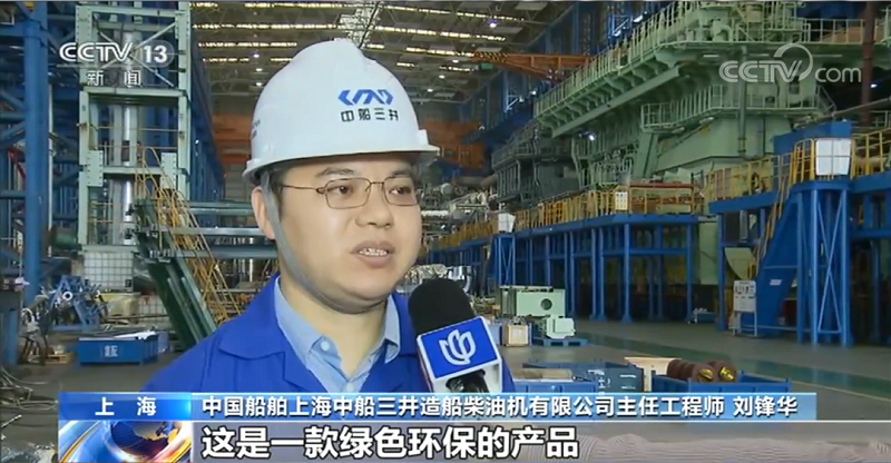 ????中國船舶上海中船三井造船柴油機(jī)有限公司主任工程師 劉鋒華:尺寸最大,達(dá)到了5層樓那么高,功率達(dá)到了63800多千瓦,功率也是最大的。這是一款綠色環(huán)保的產(chǎn)品,使用燃?xì)膺\(yùn)行時氮氧化物的排放不到常規(guī)發(fā)動機(jī)的十分之一,硫氧化物和顆粒物的排放也是非常好的,不用裝任何后處理設(shè)備,都可以滿足IMO(國際海事組織)最新的排放法規(guī)要求。