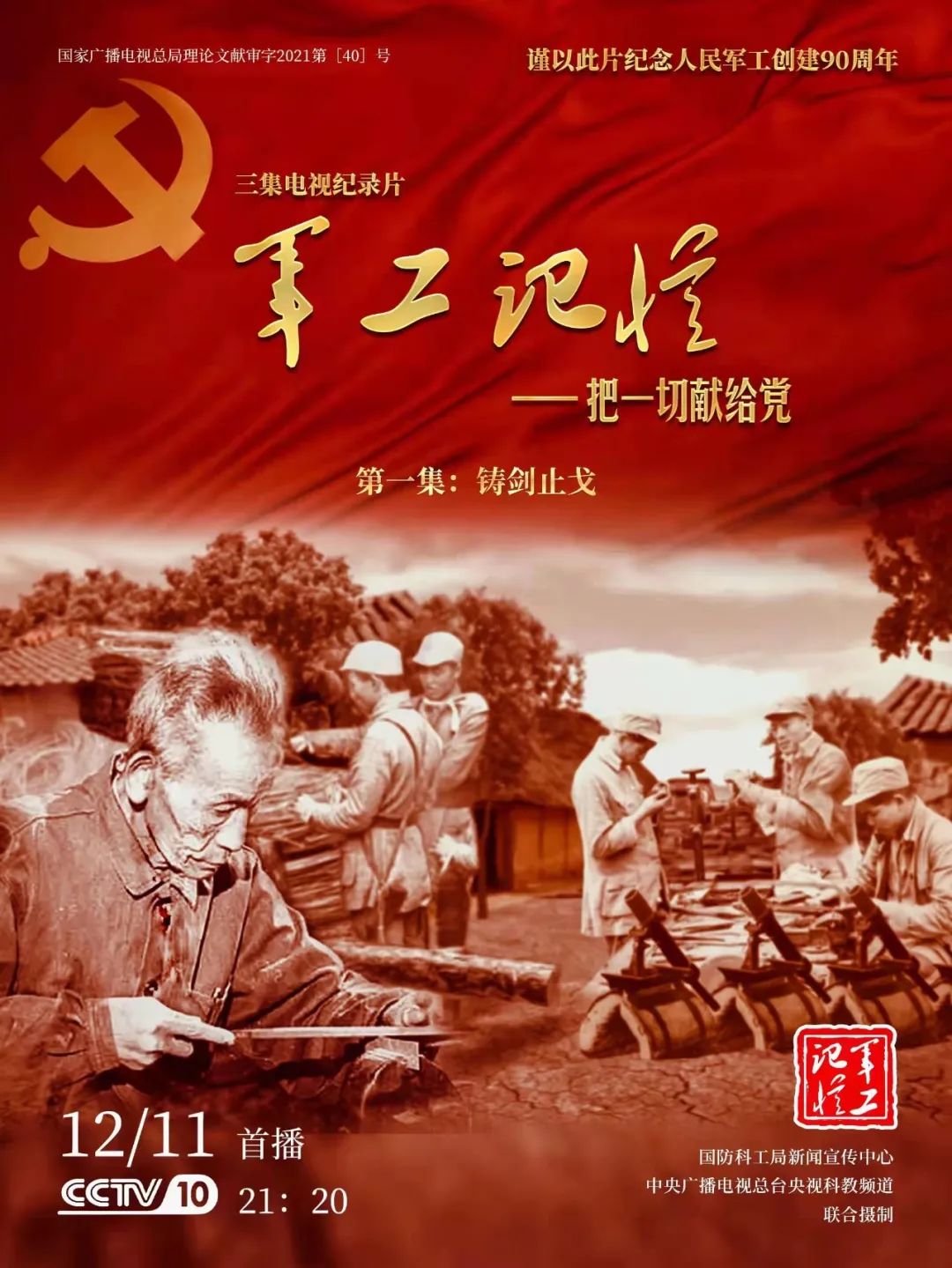 為慶祝中國(guó)共產(chǎn)黨成立100周年,紀(jì)念黨領(lǐng)導(dǎo)下的人民軍工創(chuàng)建90周年,由國(guó)防科工局指導(dǎo),國(guó)防科工局新聞宣傳中心聯(lián)合中央廣播電視總臺(tái)社教節(jié)目中心攝制,各軍工集團(tuán)大力支持的3集重大理論文獻(xiàn)電視紀(jì)錄片《軍工記憶——把一切獻(xiàn)給黨》,將于12月11日21:20在央視科教頻道(CCTV-10)《探索發(fā)現(xiàn)》欄目首播,連續(xù)播出3天。該紀(jì)錄片旨在向建黨百年獻(xiàn)禮,向人民軍工90周年致敬,向全社會(huì)弘揚(yáng)軍工精神傳遞軍工文化,激勵(lì)國(guó)防科技工業(yè)戰(zhàn)線廣大干部職工不忘初心、接續(xù)奮斗,為實(shí)現(xiàn)強(qiáng)軍強(qiáng)國(guó)夢(mèng)想貢獻(xiàn)力量。