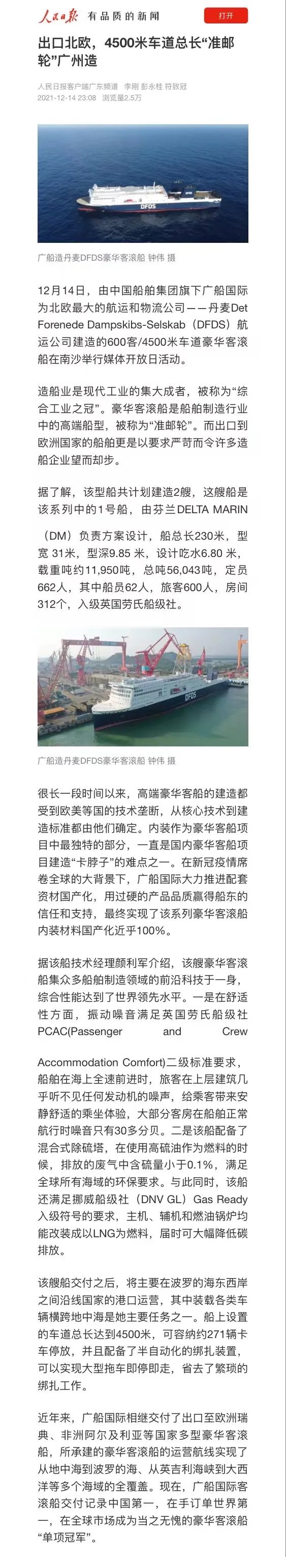 對(duì)這艘“準(zhǔn)郵輪”的高端船舶,媒體盛贊廣船國(guó)際在新冠疫情席卷全球的大背景下,大力推進(jìn)配套資材國(guó)產(chǎn)化,用過硬的產(chǎn)品品質(zhì)贏得船東的信任和支持,最終實(shí)現(xiàn)了該系列豪華客滾船內(nèi)裝材料國(guó)產(chǎn)化近乎100%,是當(dāng)之無(wú)愧的豪華客滾船“單項(xiàng)冠軍”。