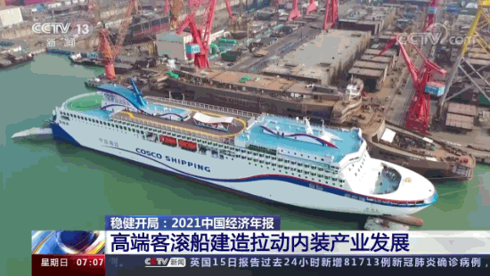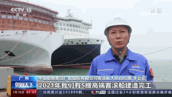 這里是中國船舶廣船國際的造船碼頭,多艘大型豪華客滾船正在緊張調(diào)試和建造。負責人告訴記者,2021年,像這樣的高端客滾船他們廠一共建造完工了5艘,產(chǎn)值占比達到約40%。