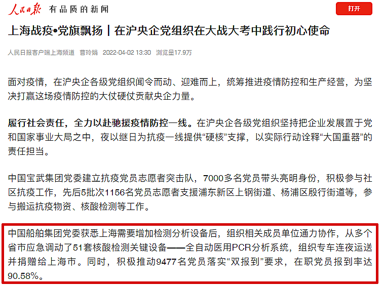 “中國(guó)船舶集團(tuán)黨組獲悉上海需要增加檢測(cè)分析設(shè)備后,組織相關(guān)成員單位通力協(xié)作,從多個(gè)省市應(yīng)急調(diào)動(dòng)了51套核酸檢測(cè)關(guān)鍵設(shè)備——全自動(dòng)醫(yī)用PCR分析系統(tǒng),組織專車(chē)連夜運(yùn)送并捐贈(zèng)給上海市。同時(shí),積極推動(dòng)9477名黨員落實(shí)‘雙報(bào)到’要求,在職黨員報(bào)到率達(dá)90.58%?!?/p>