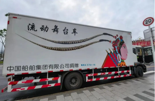 在中國(guó)船舶廣場(chǎng)揭牌儀式現(xiàn)場(chǎng),一輛印有中國(guó)船舶集團(tuán)有限公司捐贈(zèng)的流動(dòng)舞臺(tái)車(chē)格外醒目,工作人員告訴記者:“過(guò)去送文化下鄉(xiāng)巡回演出,由于需要不斷改變巡演地點(diǎn),刮風(fēng)下雨就只能‘望雨興嘆’,現(xiàn)在有了移動(dòng)舞臺(tái)車(chē),10分鐘內(nèi)就將所有設(shè)備安裝到位,并且車(chē)內(nèi)預(yù)留了燈光、聲音、字幕、幕布、電源等接口,具有很好的擴(kuò)展性,車(chē)上的舞臺(tái)滿足了專業(yè)演出的需求,可以讓整個(gè)演出更具表演性,舞臺(tái)車(chē)可以直接開(kāi)進(jìn)百姓家,鄉(xiāng)親們家門(mén)口就能看表演,感謝中國(guó)船舶集團(tuán)讓文化下鄉(xiāng)不再難?!臂屡D縣民族文化工作隊(duì)隊(duì)長(zhǎng)安飄感激地說(shuō):“感謝中國(guó)船舶集團(tuán)對(duì)邊疆文化的關(guān)心,我們一定會(huì)守好文化邊疆!”。