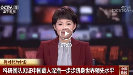 系列報道《新時代的中國》之《科研團(tuán)隊(duì)見證中國載人深潛一步步躋身世界領(lǐng)先水平》,于9月25日在央視中文國際頻道《中國新聞》欄目和《今日環(huán)球》欄目面向全球播出。