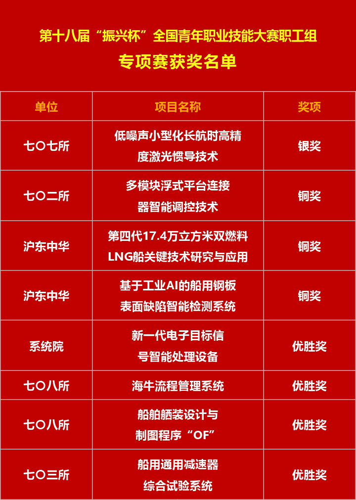 11月15日,第十八屆“振興杯”全國青年職業(yè)技能大賽職工組全國決賽在沈陽落下帷幕,中國船舶集團(tuán)青年取得主體賽(職業(yè)技能競賽)“1銀2銅7優(yōu)勝獎”、專項賽(創(chuàng)新創(chuàng)效競賽)“1銀3銅4優(yōu)勝獎”的好成績。其中,黃埔文沖吳道升、七〇七所“低噪聲小型化長航時高精度激光慣導(dǎo)技術(shù)”項目分獲銀獎,在“青春競技場”上展現(xiàn)了船舶青年的自信卓越風(fēng)采。