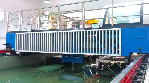 中山大學“拖曳水池建造” 項目包含了拖曳水池拖車、軌道系統(tǒng)、造消波系統(tǒng)、造風系統(tǒng)等關鍵試驗設備。拖車實現(xiàn)從0.02米/秒到8米/秒的高精度、高速比調(diào)速,滿足拖曳水池流速儀標定和船舶試驗的雙重需求;造風系統(tǒng)實現(xiàn)了風譜模擬能力。