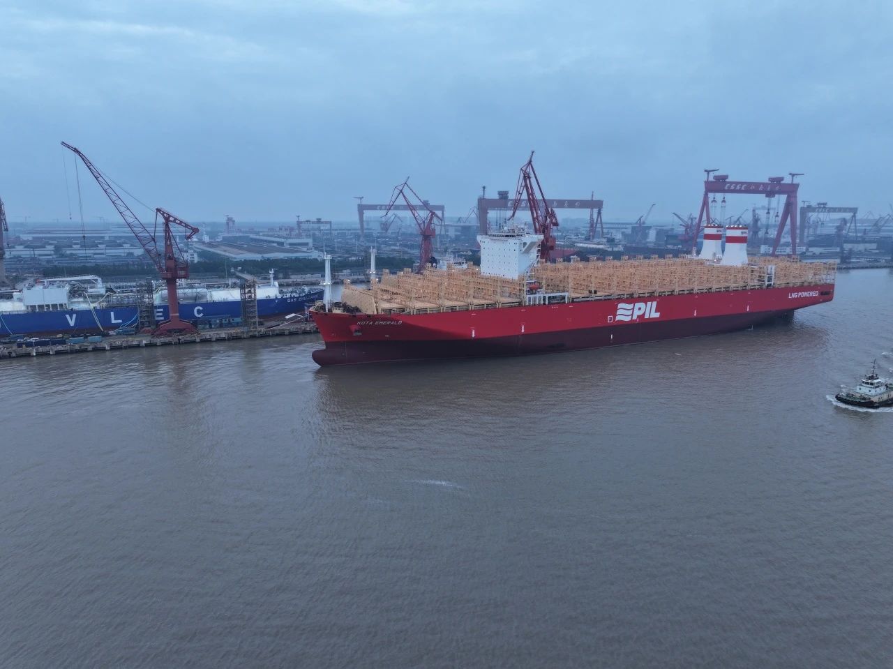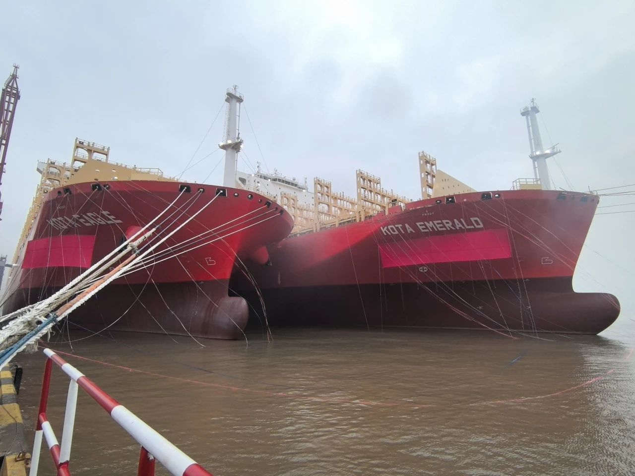 10月15日,中國船舶集團旗下江南造船聯(lián)合中船貿(mào)易為太平船務建造的14000TEU液化天然氣(LNG)雙燃料動力系列集裝箱船首制船“KOTA EAGLE(鷹城)”號和2號船“KOTA EMERALD(翠城)”號同日命名,其中“KOTA EAGLE(鷹城)”號于當日簽字交付。
